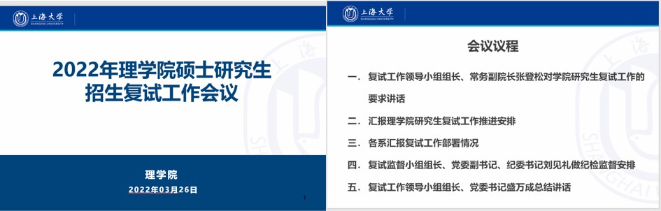主要包括复试会务准备、落实复试命题、遴选复试专家、名额分配方案、成立领导小组和监督小组、复试工作和管理办法、各系复试工作方案等系列文件,并对各学科复试测试、专家演练、研究生复试安排等进行了详细汇报。随后,williamhill体育在线登录数学学科、物理学科和化学学科分别汇报了研究生复试的具体执行方案。会上通过反复讨论复试工作具体操作方式,进一步保障复试各项工作措施和方案落地。williamhill体育在线登录复试工作领导小组副组长、党委副书记、纪委书记刘见礼介绍了2022年williamhill体育在线登录研究生复试监督小组基本情况和主要职责,强调学院会加强研究生复试监督工作,确保研究生招生工作公开、公正、公平进行。