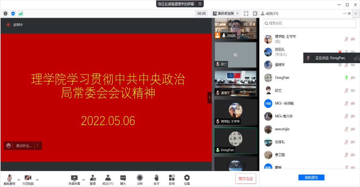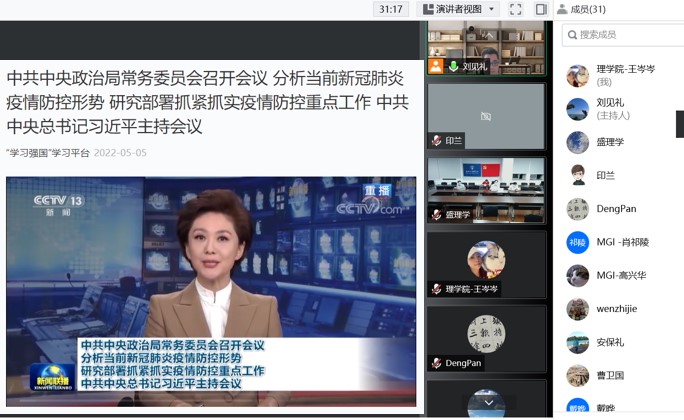 最后学院党委书记盛万成同志进一步解读会议精神,他指出中央政治局的会议精神大家一定要逐句逐字的去理解,每句话都包含深意。我们的防控方针不动摇,是由党的性质和宗旨决定的,我们要坚定信心。二是现在还不是放松歇气的时候,要深刻、完整、全面认识党中央确定的疫情防控方针政策,坚决克服轻视、无所谓、自以为是等思想。各支部要迅速将习近平总书记重要讲话精神和市委相关要求传达到每一个党员。第三我们每个党员在各个领域和岗位中发挥先锋模范作用,有些在社区担任志愿者,有些在学校值守,学工队伍守护学生健康,还有在封控楼的辅导员和教师、送饭天团等等。随着形势向好,我们要进一步做好复工复产方案,同心协力,共战疫情,期待早日在校园相见。