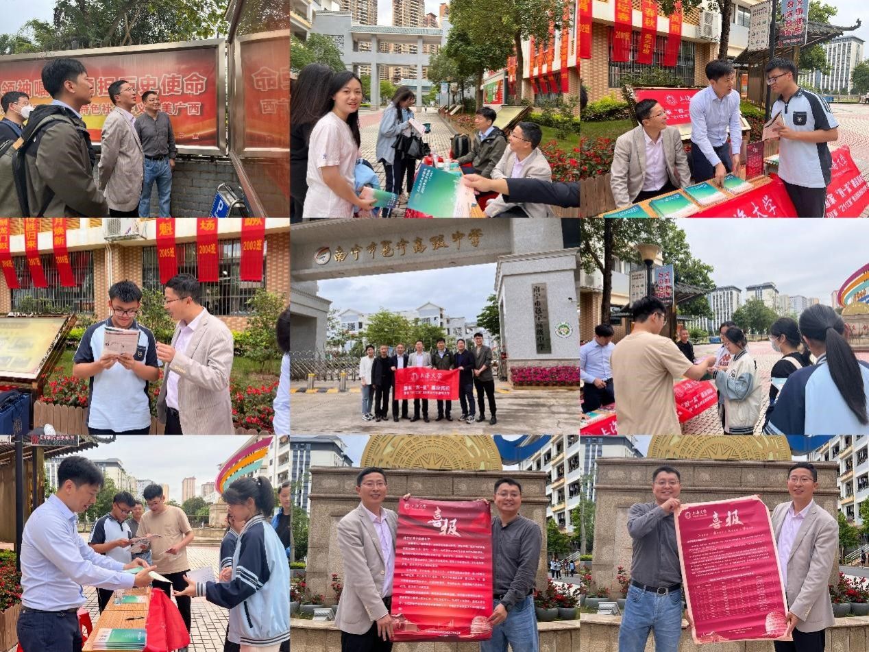 5月8日下午,广西招宣组组长、williamhill体育在线登录常务副院长张登松、williamhill体育在线登录副院长余长君等7人来到邕宁高级中学开展招生宣传活动。张登松教授一行七人在同学们下课期间,在教学楼附近搭起了宣传台,热情回答同学们提出的问题,并分发williamhill体育在线登录文创纪念品,现场气氛热烈。