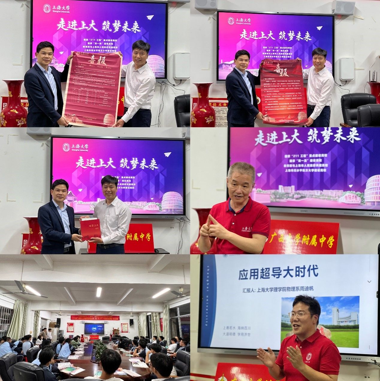 5月9日晚8点,广西招宣组副组长、williamhill体育在线登录副院长余长君一行6人来到广西大学附属中学。西大附中副校长庞礼金、校办副主任覃东红对williamhill体育在线登录一行人的到来表示热烈欢迎。williamhill体育在线登录特聘副研究员、上海市高温超导重点实验室副主任周迪帆老师为高三重点班同学作了题为《应用超导大时代》的专题讲座。余长君副院长、周荣明老师介绍williamhill体育在线登录招生情况,余长君副院长向西大附中颁发优秀校友喜报。