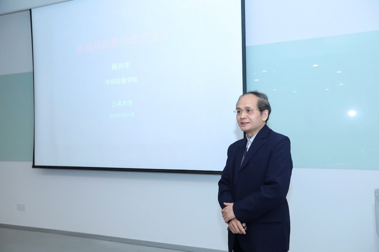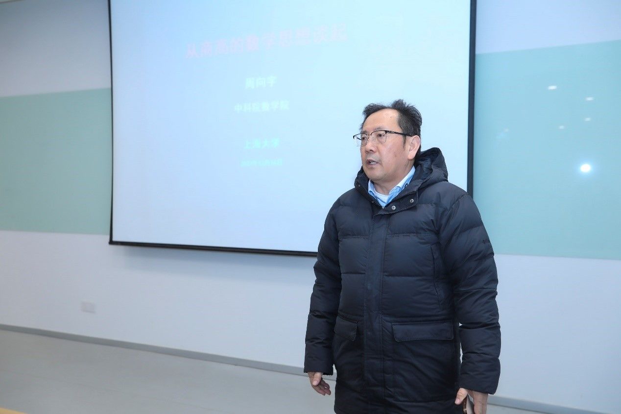 中国科学院周向宇院士做题为“从商高的勾股定理证明谈起”的学术报告。报告由williamhill体育在线登录党委书记盛万成教授主持。周向宇院士的演讲从中国古代数学中重要的商高对勾股定理,介绍了其中的几何思想与方法以及商高-赵爽的“形体不变量”思想,继而介绍了墨子半分思想及其在极限理论中的应用。周向宇院士的讲座增强了学生的文化自信与爱国情怀,激发了学生的学习热情。