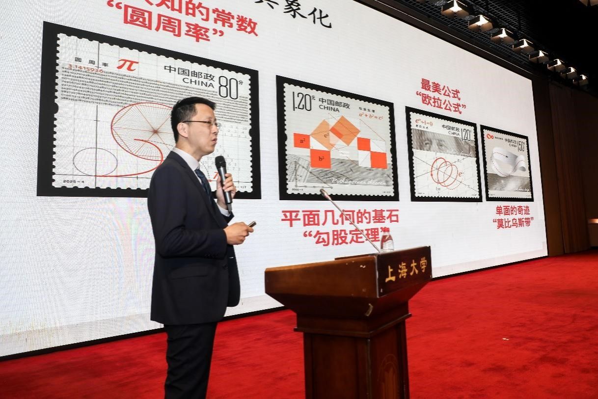 李伟代表中国邮政集团有限公司宣读《数学之美》特种邮票发行通告。此次发行的《数学之美》特种邮票一套四枚,面值分别为80分、1.20元、1.20元、1.50元,即日起在全国邮政网点及线上平台同步发售。邮票以数学四大经典为灵感,展现数学的深邃魅力,传递人类对真理的不懈追求。