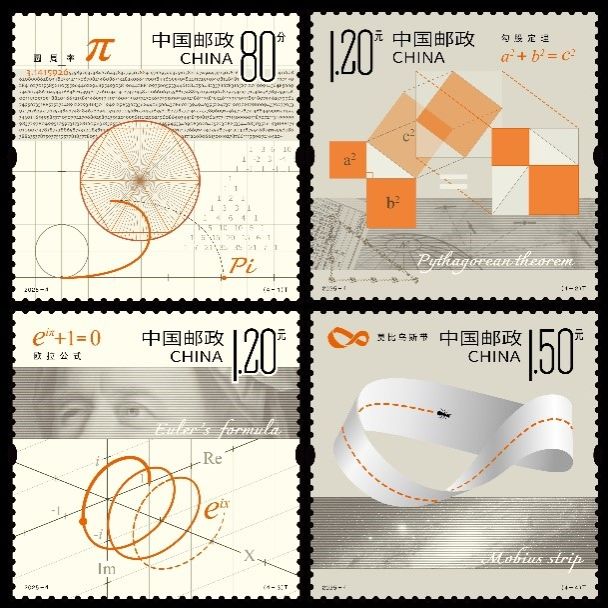 邮票画面以圆周率π、勾股定理、欧拉公式、莫比乌斯带四大数学经典为核心元素,邮票创新采用日光型荧光油墨,自然光与紫外线下呈现多维视觉效果;钥匙形异形齿孔象征“数学是科学之钥”;极细线印刷技术突破行业精度极限,体现数学的严谨特质,在方寸间呈现数学的理性之美与灵动之韵。