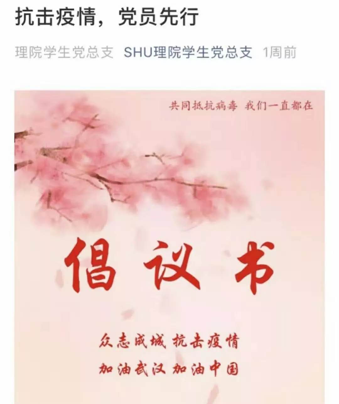 2月3日,教育部发出致全国大学生的一封信,信中写道:每一位同学都牵系一个家庭,每一个青年应担当一份使命,自觉做科学的传播者、谣言的粉碎者、健康的守护者、家庭的关爱者。”在新型冠状病毒防控工作中,身处在全国各地的党员们也即刻行动,他们或服务师生、或志愿服务、或爱心奉献,让初心使命在这场战疫中闪闪发光。程洁等5名党员自愿缴纳特殊党费,为打赢本次战疫贡献自己的力量。我院俱李菲、钟玉义等10名研究生党员参与本地区隔离防护、道口查控以及上门巡查等防控相关工作,彰显williamhill官网研究生的担当。吴中梅、王晶洁等35名学生干部,协助上大校友顾黎星,依托上大秦甲中心,参与救援物资对接物资,现已辐射湖北、湖南、江西等多地医院、红十字会。虽然有些同学不能投入抗疫战争,但范文斌等同学他们以笔为枪,与全国各地音乐人在线协作,用旋律书写抗击疫情的赞歌,引导广大青年弘扬正能量,在这场全民战争中紧随党的步伐,增强大学生的使命担当,凝聚力量,共克时艰。
