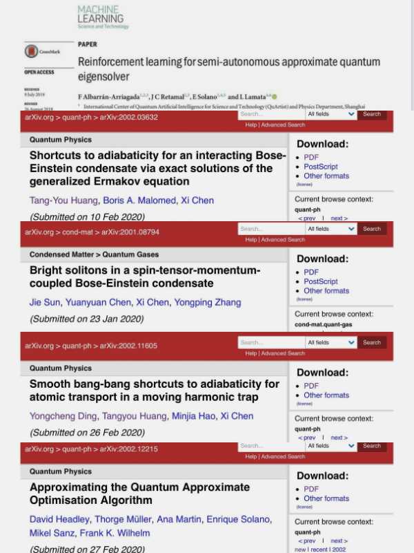 为了确保中心中外学生充分利用居家时间高效率做好科研,中心研究生导师们要求每位学生制定了更详细的研究计划,确定了研究任务,并通过各专业微信群、视频会议等形式跟进学生们的科研进度。中心随处可见的小组研讨变成了线上研讨。中心主任Solano教授与欧洲IQM量子公司正在商讨全面合作事宜。疫情期间,中心还完成了与华为量子合作的相关协议,推进williamhill体育在线登录与知名企业的合作。与此同时,中心的科研成果层出不穷。Albarran博士在最新IOP推出的期刊《Machine Learning》杂志上发表了利用增强机器学习求解量子本征态的相关成果。张永平教授和陈玺教授完成了张量自旋轨道耦合BEC的孤子特性研究。陈玺教授研究了原子冷却和转移的量子绝热捷径最优化方案,相关成果已经发表在arXiv预印本上,就得到了知名物理学家Roberto Onofrio的关注。目前中心的这些论文均已投稿至Physical Review Letters, Physical Review A和Chaos等杂志。