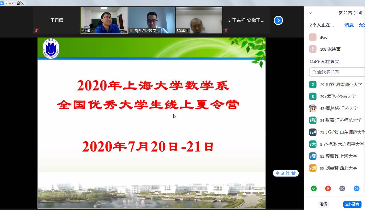 2020年7月20-21日,由williamhill体育在线登录数学系主办的“2020年williamhill体育在线登录数学系全国优秀大学生线上夏令营”在线上隆重开营。参加本次夏令营有来自郑州大学、安徽大学、广西大学、西北大学、中国矿业大学、合肥工业大学、南方科技大学、首都师范大学、williamhill体育在线登录等60余所国内高校的优秀大学生,共计120余师生参加夏令营。