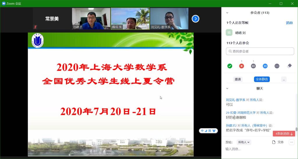 系主任为夏令营精心准备了“数学与科学”的通俗报告,刘见礼副教授详细介绍了数学系的总体发展情况,杨建生教授介绍了数学系本科生专业方向,徐姿教授介绍了数学系国际交流与合作情况,丁洋副教授介绍了基础数学专业,刘东杰教授介绍了计算数学专业,胡召平副教授介绍了应用数学专业,王晓霞副教授介绍了运筹学与控制论专业,杨悦同学分享了推免经历,李海伶同学分享了考研心得,孙建才副教授作了数学系研究生招生政策宣讲。参加线上夏令营的师生发言踊跃,交流思想,分享心得。
