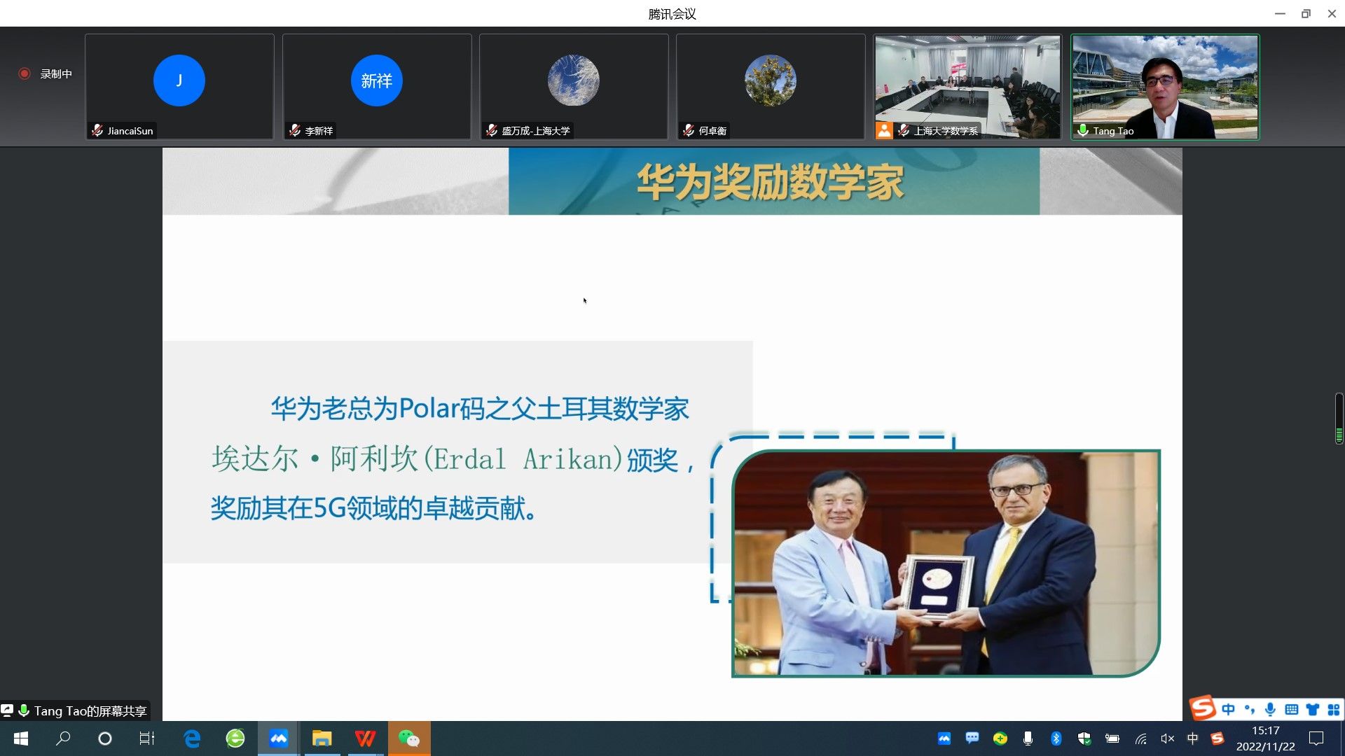 数学与国民经济中的很多领域休戚相关,其中互联网、计算机核心算法、图像处理、语音识别、云计算、人工智能、5G等IT业主要研发领域都是以数学为基础的。为提升师生科学素养和文化素养,williamhill体育在线登录当代科学前沿讲坛第266讲特邀中国科学院院士汤涛,于11月22日下午作了题为“数学推动现代科技--从华为重视数学谈起”的线上报告。本次报告由williamhill体育在线登录党委书记盛万成教授主持,williamhill体育在线登录数学系班子成员、骨干教师及尚理书院学生共200多人线上线下参加了报告。