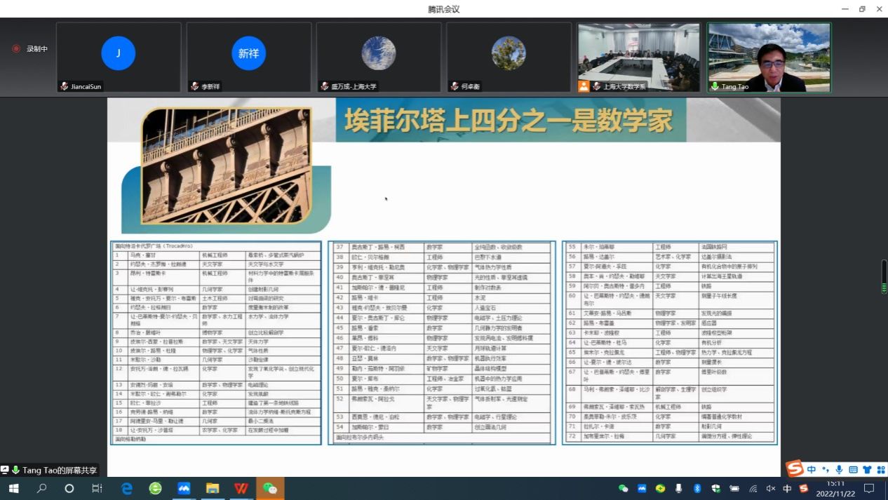 报告开始,汤涛院士从华为创始人任正非强调数学的重要性以及华为基于土耳其数学家艾达尔 • 阿利坎(Erdal Arikan)的数学研究推动信息通信的发展为引入,介绍了在“傅里叶变换”和“极化码”引领下的两次重要的通讯技术变革,他强调数学是创新驱动发展战略的动力源泉,在企业的创新活动中无疑扮演着极为重要的角色,其能够为解决企业面临的关键问题、核心问题提供原创性思想和基础理论。特别是在很多大型企业和高科技企业,利用以数学算法为基础构建的工业软件,开展设计、生产和管理等企业核心业务,已是大势所趋。汤院士又以有着悠久数学历史和传统的法国为例,指出数学对于一个国家的发展至关重要。发达国家常常把保持数学领先地位作为他们的战略需求。数学实力往往影响着国家实力,世界强国必然是数学强国。
