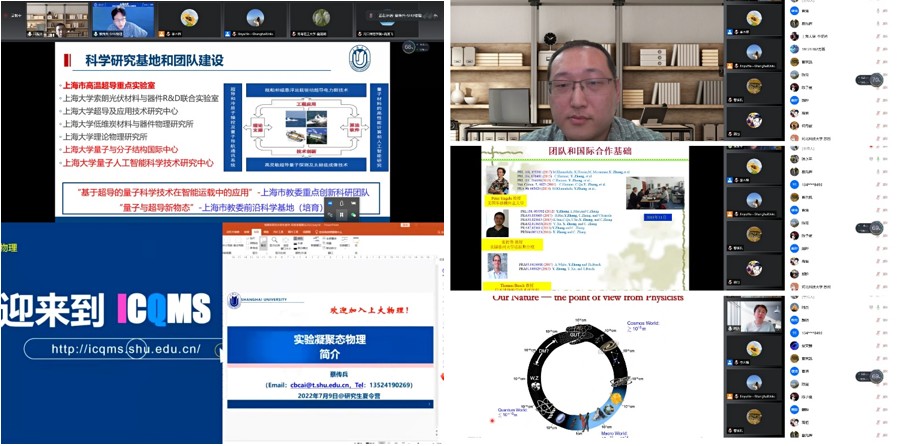 本次宣讲以理论物理、光学、无线电物理、凝聚态物理四个二级学科方向为基础,按模块进行宣讲,每个模块包括二级方向发展整体情况介绍与主题宣讲。9号下午,李征鸿教授对光学与无线电物理两个二级方向作了整体情况介绍,接下来光学方向的曹清教授、马国宏教授、戴晔教授进行了专题宣讲,无线电方向的申明教授、张永平教授、陈玺教授进行了学术报告。随后,敖平教授进行了主题宣讲,陆杰教授对理论物理方向进行了学科介绍。参加线上夏令营的师生都非常投入,发言踊跃,积极交流。10日上午由凝聚态方向的领军人物——蔡传兵教授、任伟教授分别对凝聚态的实验和理论计算两大方面进行了总览介绍。随后邓振炎教授、龚永勇教授、尹鑫茂教授、刘俊杰老师、郭盼博士、高恒博士、李永乐副教授对凝聚态方向内的研究内容做了进一步详细介绍,为在座的学生答疑解惑,分享传授经验。在师生互动交流环节中,教授与营员们面对面接触,大家一起讨论问题。老师的风趣和亲切让大家放下了顾虑,活动现场异常热烈。