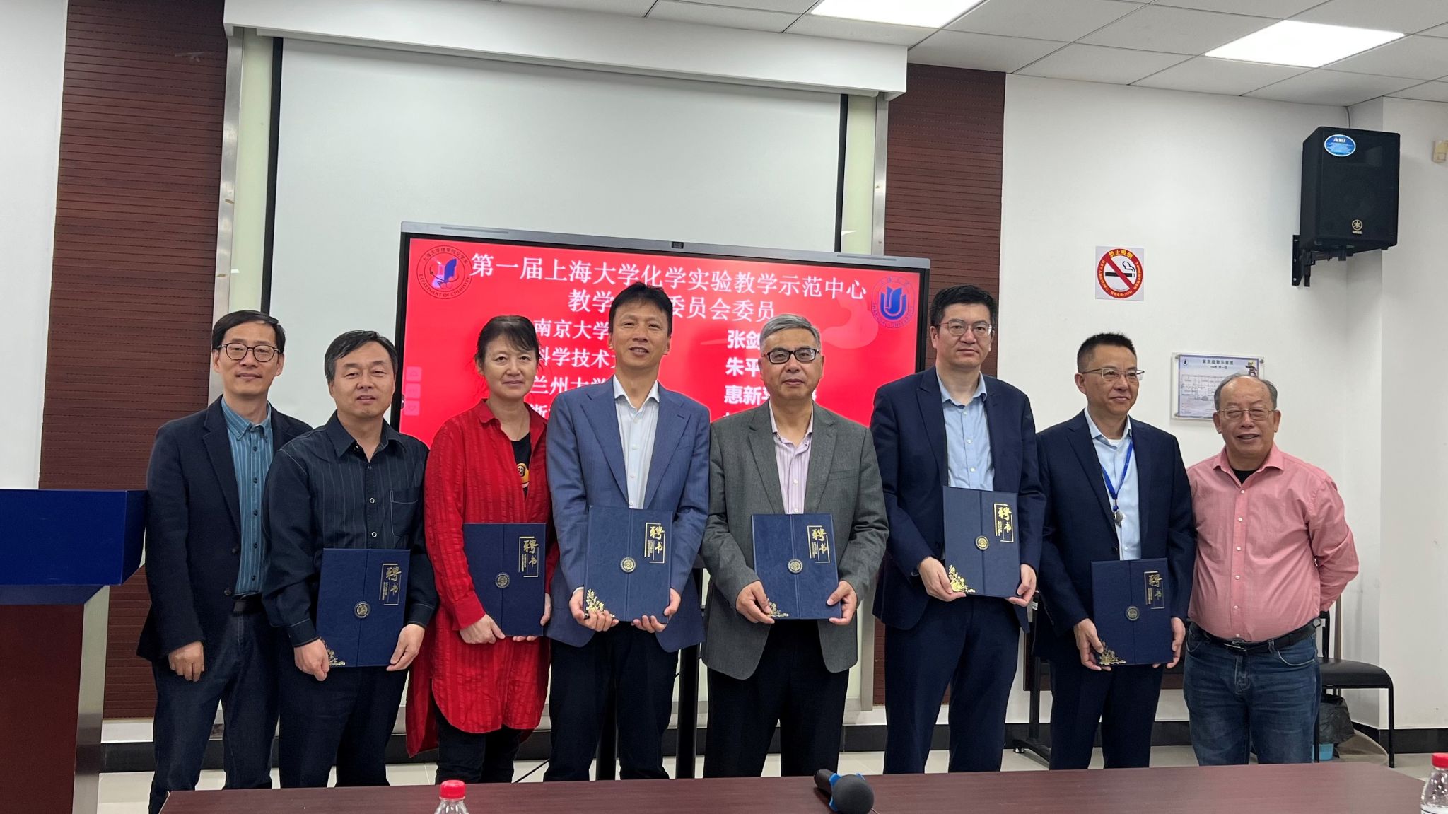 杜晓庆和曹卫国教授为化学实验教学示范中心第一届教学指导委员会的委员们颁发了聘书。