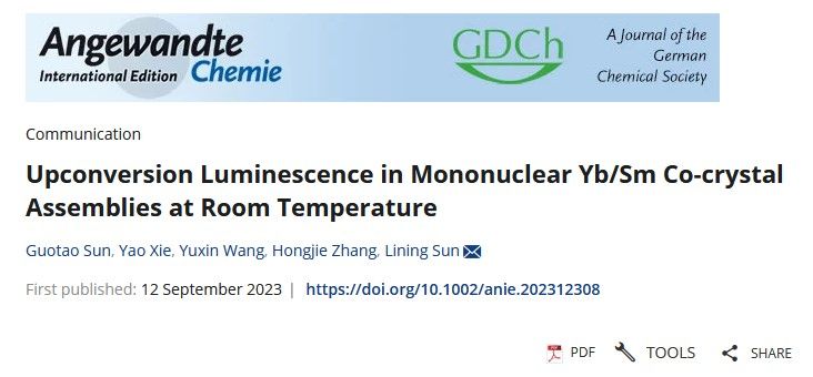 近日,williamhill体育在线登录孙丽宁教授团队在分子水平的稀土上转换发光领域又取得重要进展,相关研究结果以“Upconversion Luminescence in Mononuclear Yb/Sm Co-crystal Assemblies at Room Temperature”为题发表在化学顶级学术期刊《德国应用化学》(Angewandte Chemie International Edition,JCR和中科院一区Top)上。该论文第一作者为2020级博士生孙国涛,williamhill体育在线登录为第一作者单位和唯一通讯作者单位。