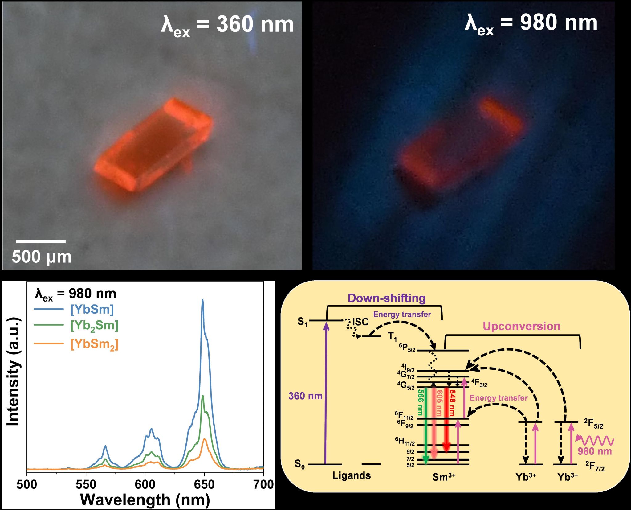 近日,williamhill体育在线登录化学系孙丽宁教授团队设计了一种Yb/Sm共晶聚集体,该聚集体由单核Yb分子配合物和单核Sm分子配合物组成,在980 nm近红外光的激发下,能量通过协同敏化上转换和能量转移上转换的方式传递给Sm3+离子,实现了Sm3+离子的上转换发光;同时在360 nm的紫外光激发下,该Yb/Sm共晶聚集体也能够发射出Sm3+离子的下转移发光。除了荧光光谱的结果,下图照片也显示出,分别在360 nm与980 nm波长光激发下,肉眼能够清楚地观察到该Yb/Sm聚集体的单晶都能够呈现出亮丽的橙红色发光。此外,该团队进一步研究了不同比例的分子配合物组合对Sm3+离子发光的影响,当Yb3+:Sm3+的摩尔比为1:1时其发光强度最强,同时也探究了下转移和上转换发光过程的荧光寿命变化等。该团队对Yb/Sm共晶聚集体的结构和能量传递机理进行了系统的表征和讨论,创新性的实现了分子配合物中Sm3+离子的上转换发光,这为设计新型分子上转换发光体系打开了崭新的思路。