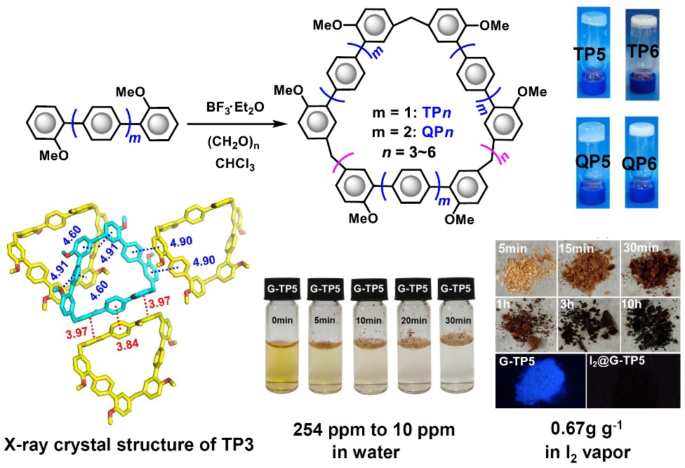 传统的共价超分子大环主体比如环糊精、葫芦脲、杯芳烃等尽管对小的客体分子表现出很好的主客体性质,但是由于它们的空腔尺寸一般都小于1nm,因此难以识别一些生物分子比如多肽和蛋白质等。基于联苯[n]芳烃的启发,该团队以更长的、刚性的三联苯和四联苯为单体设计合成了两种新型的、具有更大空腔结构的三联苯[n]芳烃和四联苯[n]芳烃,其中最大的环分子空腔直径超过3nm。更有趣的是两类大环的环状五聚体和六聚体表现出很好的自组装行为,在有机溶剂中很容易形成超分子有机凝胶,形成凝胶机制是通过多联苯之间的π???π堆积相互作用。而且,这些有机干凝胶能够作为优异的放射性碘捕获材料,不仅能够在水中有效地吸附碘分子(<10ppm ),而且对碘蒸汽具有很好的捕获能力(0.67 g g-1)。