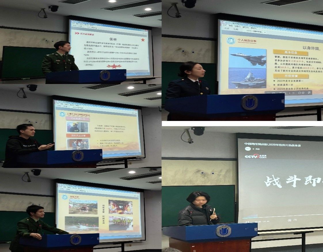 身穿黑色军装的曹颖学姐曾服役于海军部队,在役期间同样是获誉无数。她先是向大家分享了自己参军的动机,提醒大家无论家国情怀还是专业不适,入伍都不失为一个不错的选择,然后纠正大家对部队生活想象的误区:海军未必上舰、空军未必上机、陆军未必打靶,最后以自己日常训练、值夜班的经历让大家了解海军的日常生活。