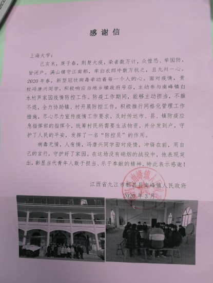 冯唐兴,williamhill体育在线登录物理系电子信息科学与技术专业18级本科生。在2020年2月4日至2月28日期间,冯唐兴同学作为志愿者参加了江西省南峰镇白水村芦家园的防疫行动,为这场无声的战役奉献出了自己的一份力量。直到近日,williamhill体育在线登录党委收到了当地镇政府部门的一份表扬信,才知道他为当地防疫工作整整工作了差不多一个月时间。