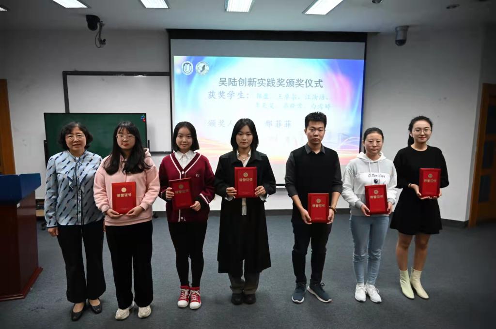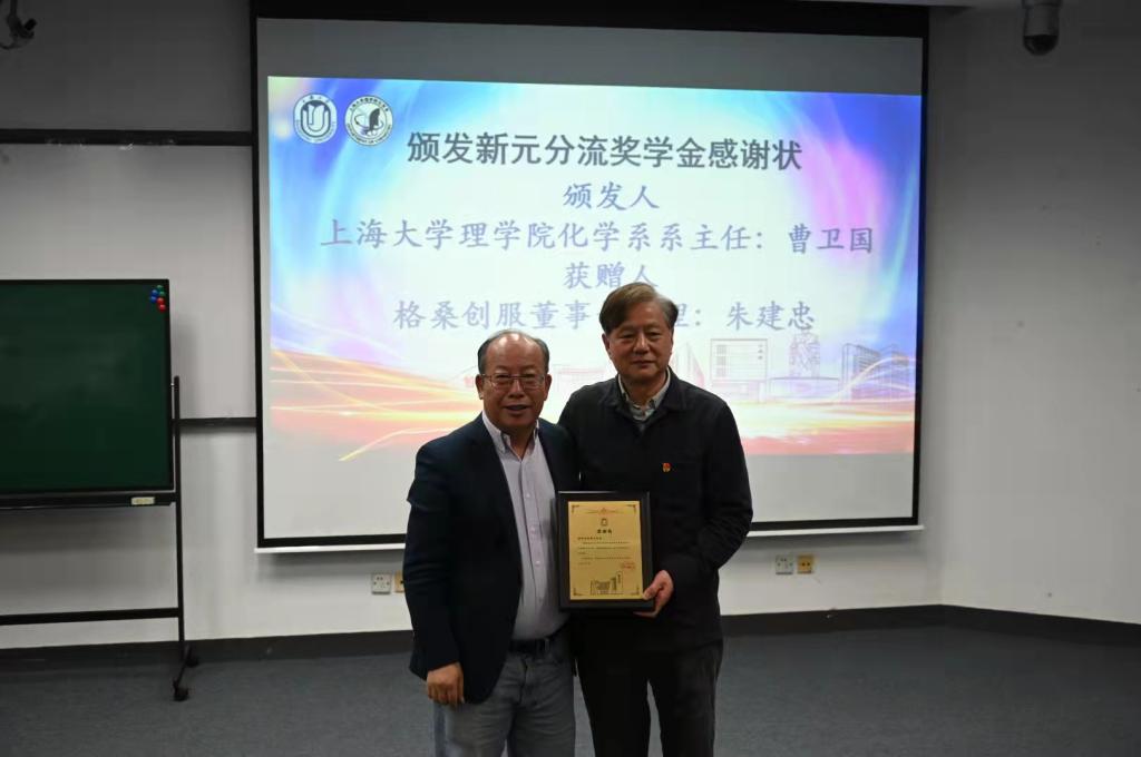 随后,颁发了新元分流奖学金。该项奖学金由格桑创服董事长、化学系校友徐新元先生捐赠,用以奖励在专业分流中成绩优秀、选择应用化学专业的同学们。来自格桑创服的董事长助理朱建忠先生为同学们颁发了荣誉证书,并作为格桑创服的代表接受了化学系系主任曹卫国教授颁发的感谢状。来自williamhill体育在线登录化学系的获奖学生代表刘奕分享了专业分流时的情景,表达了对化学专业的喜爱之情,引起场下同学们的共鸣。接着,颁发了吴陆创新实践奖学金。该项奖学金是化学系87级校友夫妇捐赠的用于培养化学系学生的基金。化学学科党总支书记邢菲菲老师为获奖学生颁奖。化学系19级学生郭盈代表获奖学生发言,不仅表达了对捐赠校友的感谢,同时也向化学系的老师们长期以来细致的指导、关心和帮助表示感谢。