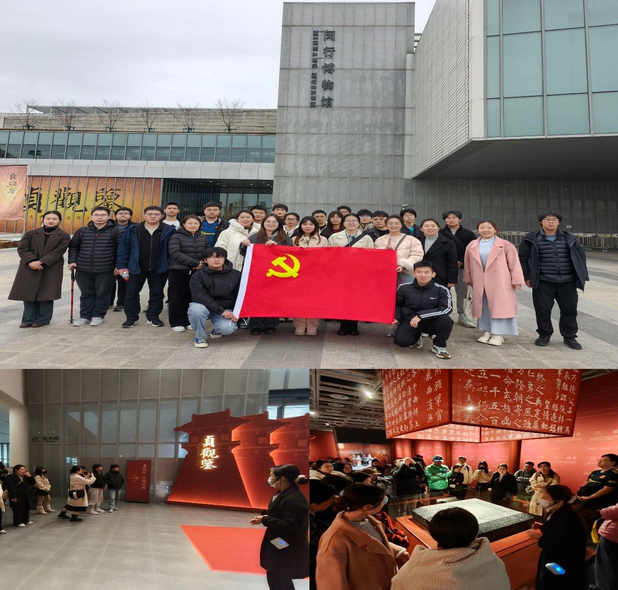 下午,大家进入闵行博物馆进行参观。闵行博物馆“贞观鉴”大唐历史文化主题展再现辉煌唐史。三彩载乐骆驼俑阵列重现丝路商队风采,胡旋舞俑鎏金花冠与粟特银盘交相辉映,印证长安作为国际都会的多元交融。展览以唐太宗李世民时期贞观盛世为核心,通过132件珍贵文物,全面展示大唐初年的辉煌文化,师生们聚精会神聆听讲解员介绍,或驻足观赏,或拍照留念,热情高涨。